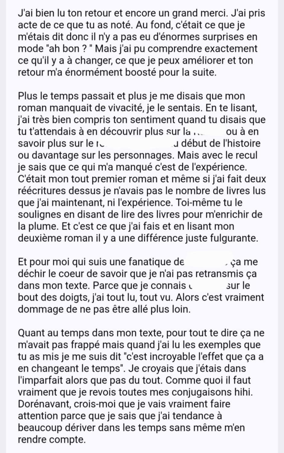 Un grand MERCI pour ta bêta-lecture, ton honnêteté et ta bienveillance. C'était au-delà de ce que j'attendais ! J'avais peur des commentaires négatifs, et tu les pointes sans méchanceté. Tu as toujours des mots encourageants et on se sent SAFE avec toi. J'ai ri à certaines de tes réactions et ça me conforte dans mon projet. Je recommande +++ !