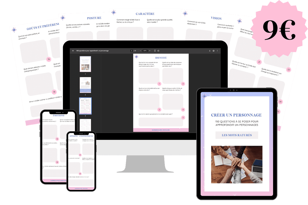 D'ailleurs, tu peux télécharger ici un workbook comprenant 150 questions pour approfondir un personnage, proposé par mon partenaire L'académie des Mots Raturés.